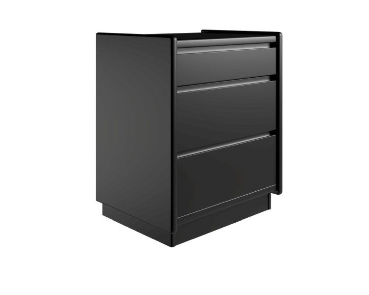 Sengebord fra danske Kaagaard. 335037 sengebordet har et enkelt design med elegante afrundede hjørner. Bordet består af en lav skuffe og to hylder med en masse plads til opbevaring. Bordet er sortmalet og har et minimalistisk design, som med fordel kan tilføjes til eksisterende indretninger, og som passer ideelt i de skandinaviske indretninger.