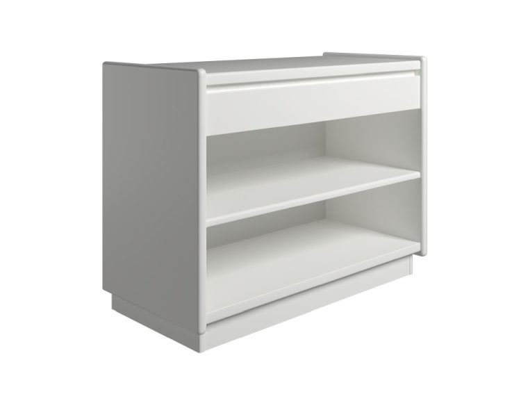 Sengebord fra danske Kaagaard. 318037 sengebordet har et enkelt design med elegante afrundede hjørner. Bordet består af en lav skuffe og to hylder med en masse plads til opbevaring. Bordet er hvidmalet og har et minimalistisk design, som med fordel kan tilføjes til eksisterende indretninger, og som passer ideelt i de skandinaviske indretninger.