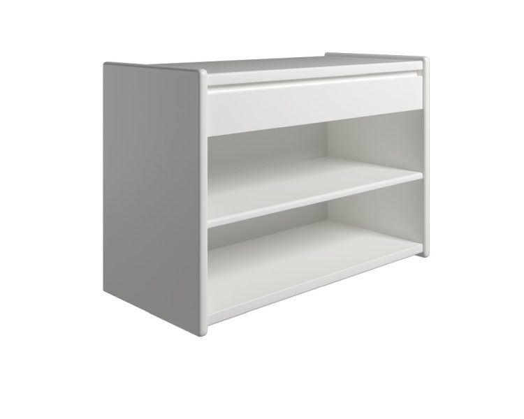 Sengebord fra danske Kaagaard. 318037 sengebordet har et enkelt design med elegante afrundede hjørner. Bordet består af en lav skuffe og to hylder med en masse plads til opbevaring. Bordet er hvidmalet og har et minimalistisk design, som med fordel kan tilføjes til eksisterende indretninger, og som passer ideelt i de skandinaviske indretninger.