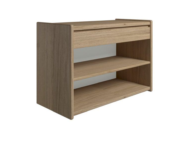 Sengebord fra danske Kaagaard. 318037 sengebordet har et enkelt design med elegante afrundede hjørner. Bordet består af en lav skuffe og to hylder med en masse plads til opbevaring. Bordet har en naturlig farve og har et minimalistisk design, som med fordel kan tilføjes til eksisterende indretninger, og som passer ideelt i de skandinaviske indretninger.