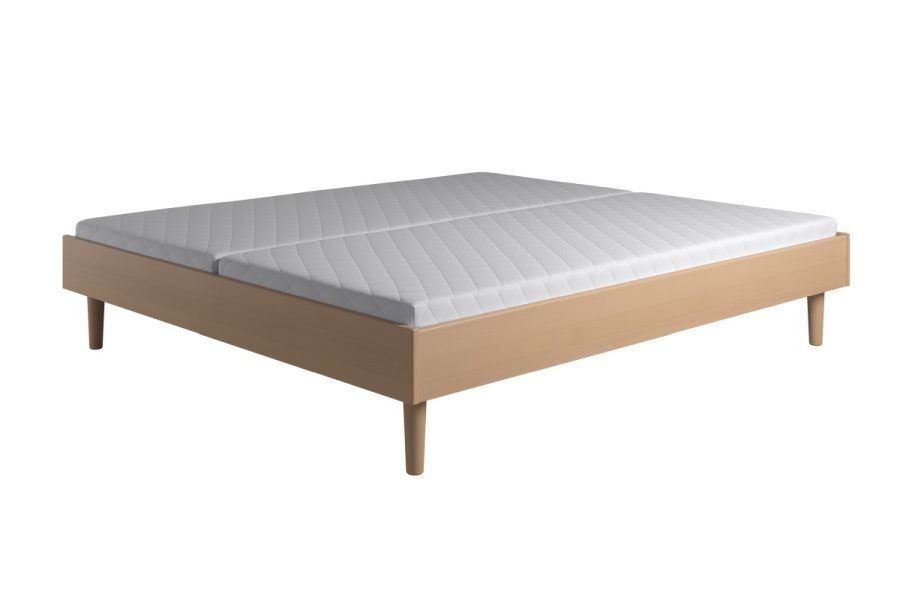 Sengeramme 380 fra danske Kaagaard. Sengerammen har et minimalistisk design og er velegnet i nordiske indretninger. Sengerammen kan bruges som elevationsseng og planbund. Ønsker du at bruge sengen som elevationsseng, er det nødvendigt at montere bærelister i siden af sengerammen. Sengen har en udvendig bredde på 186 cm og en udvendig længde på 216 cm og kan bruges med 2 madrasser i størrelsen 90x210 cm. Til sengen medfølger fire koniske træben i matchende farve.