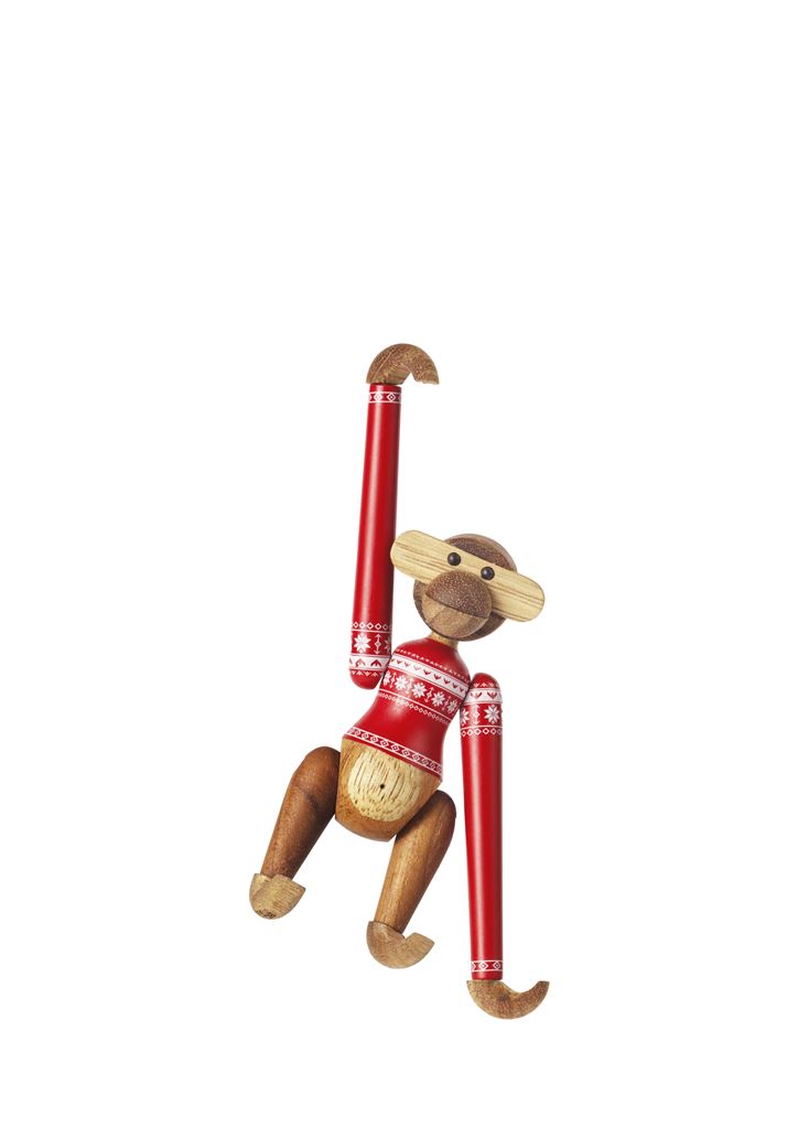 Kay Bojesen Abe i en unik juleudgave bærer en rød julesweater, der smelter sammen med den verdenskendte designklassiker og julens hygge. Kay Bojesen Abe Julesweater 2024 er lavet i FSC®-certificeret teak og fås i flere størrelser. Sweateren har et klassisk mønster med julestjerner og snefnug i hvid, mens de smalle bånd ved ærmerne prydes af et julerudemønster. Den røde farve er omhyggeligt malet, og det hvide mønster er præcist printet for at sikre et gennemført og autentisk look. Kombinationen af klassiske julefarver og Kay Bojesens humoristiske design gør aben til et livligt indslag i moderne juleindretning. Abe Julesweater 2024 er både nostalgisk og nyskabende, og tilføjer et kærligt kapitel til Bojesens ikoniske træfigurer.