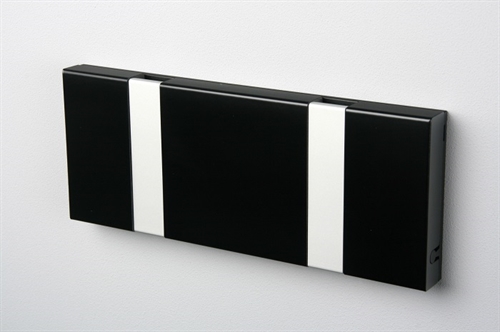 Knagerækken er i en flot sort farve, med grå knager. Den er stilfuld og dermed kan den bruges i mange indretninger. Brug knagerækken i entréen, stuen, soveværelset eller måske køkkennet. Knagerækken er 19,8 cm lang og 7,9 cm høj. Knagerækken har 2 knager. Alle knager er med vippefunktion.