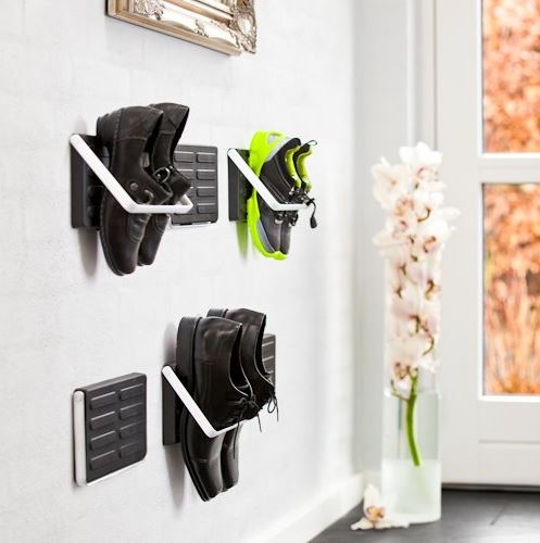 Skoholder i klassisk og minimalistisk design. Skoholderens bagplade er i pulverlakeret stål og forpladen i blød sort plast. Bøjlen af alumininium holder din sko pænt på plads mod pladen. Skoholderen kommer i farven sort med grå detaljer. Den har en bredde på 26,3 cm, en højde på 13,5 cm samt en dybde på 1,8 cm.