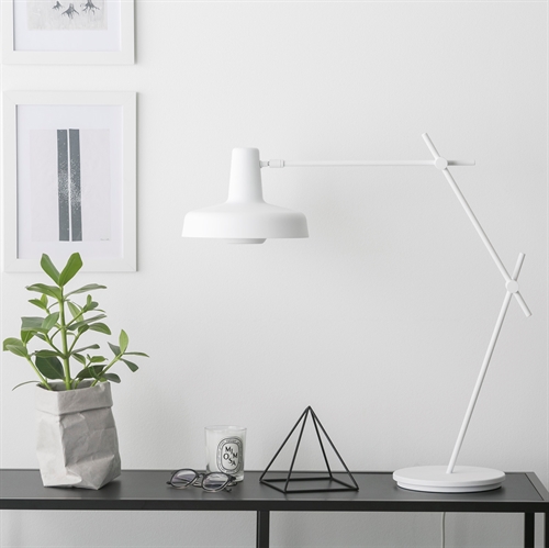 Arigato bordlampen kombinerer et yderst funktionelt og moderne design, der passer perfekt til ethvert skrivebord. Med sine tre led på lampens arm tilbyder den enestående fleksibilitet: Et led fungerer som støtte på lampefoden, mens de to andre kan justeres op og ned for at imødekomme individuelle behov. Derudover kan skærmen roteres 360°, så lysretningen let kan ændres efter ønske. Lyskilden skjules diskret bag en sort blænde, og lyset reflekteres fra den hvide indre skærm, hvilket skaber et blændfrit og diffust indirekte lys.