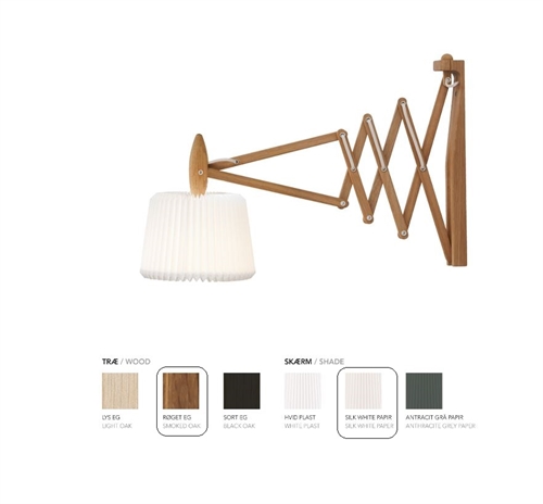 Le Klint 233-120 Saxlampe til væg H: 31 cm - Røget Eg/Silk White Farven "røget eg" og skærmfarve er markeret på billedet Den originale saxvæglampe fra Le kl Se mere ...