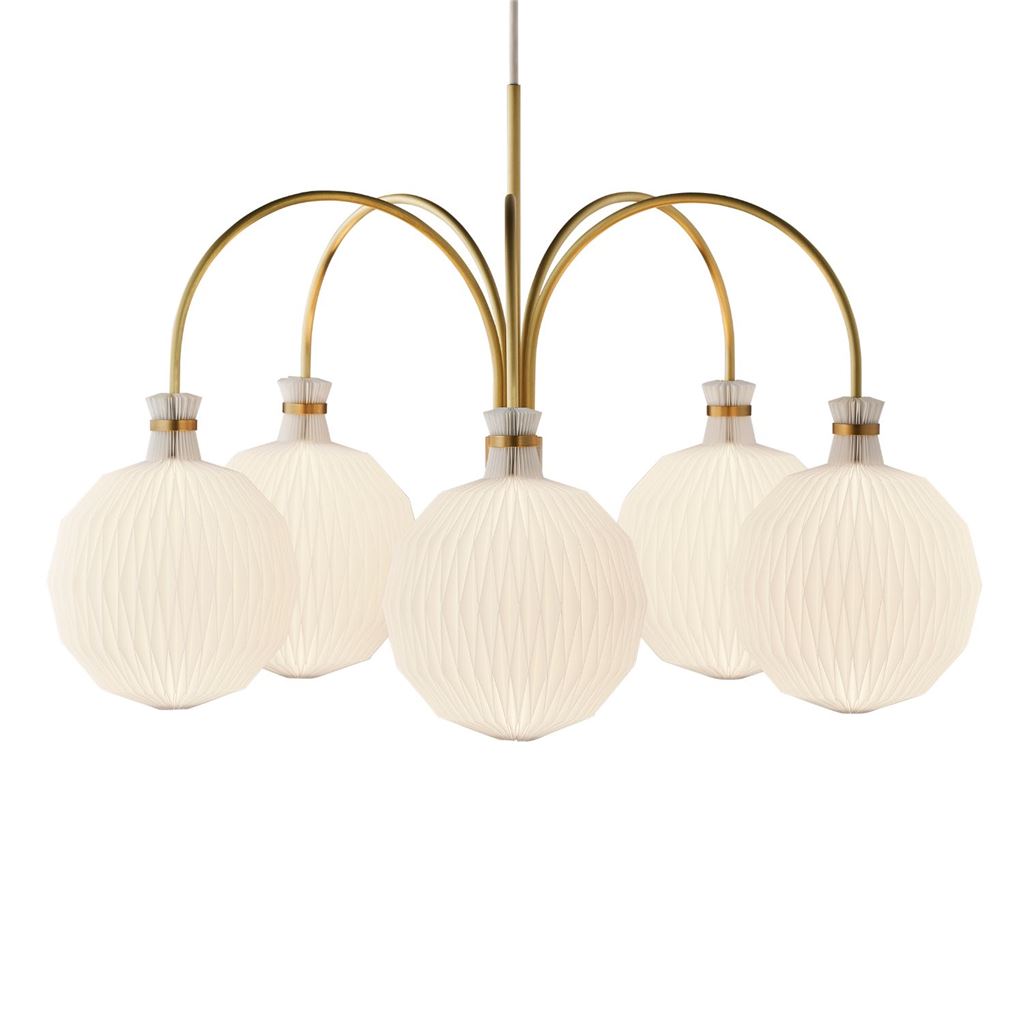 Model 101 Chandelier er en stilfuld lysekrone med fem arme og en diameter på 66 cm, hvor de elegante messingarme bærer fem smukt håndfoldede lampeskærme. Armene samles i et harmonisk midterstykke med en blød afrunding, hvilket giver lampen et afbalanceret og tidløst udtryk.
