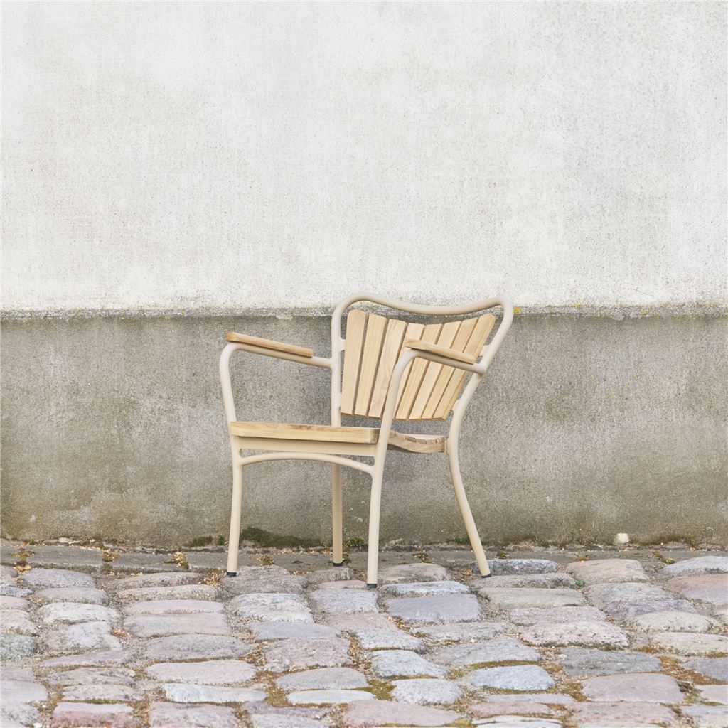 Marguerit Kids er en let, stabelbar havestol til børn, i Marguerit-serien med sæde, ryg og armlæn i teak og stel i aluminium.