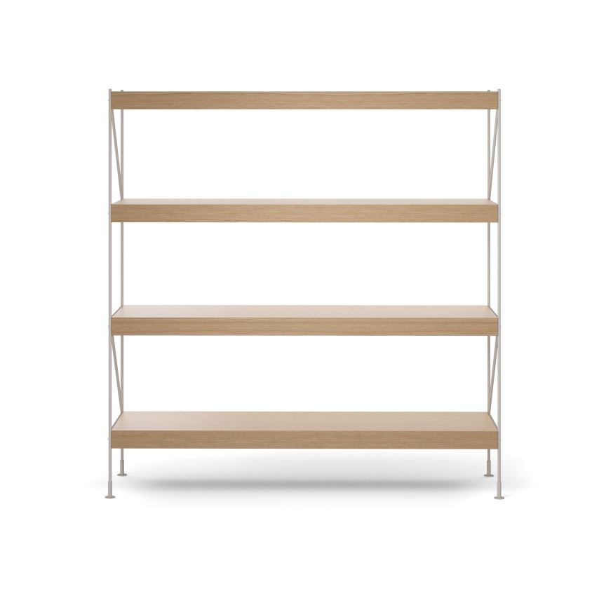 Reolens design er sofistikeret og har et elegant udtryk, der med dens neutrale farve og sine rene linjer tilføjer et smukt udseende og en hjemlig atmosfære. Reolen har 4 hylder i solid egetræ, hvilket er utrolig flot sammen med de industrielle stålben. Reolen er med dens højde ideel at have stående i køkkenet, entreen, kontoret, opholdsstuen eller spisestuen. Brug den til at opbevare dine yndlingsting og udstil dem på fineste vis med Zet storage system.