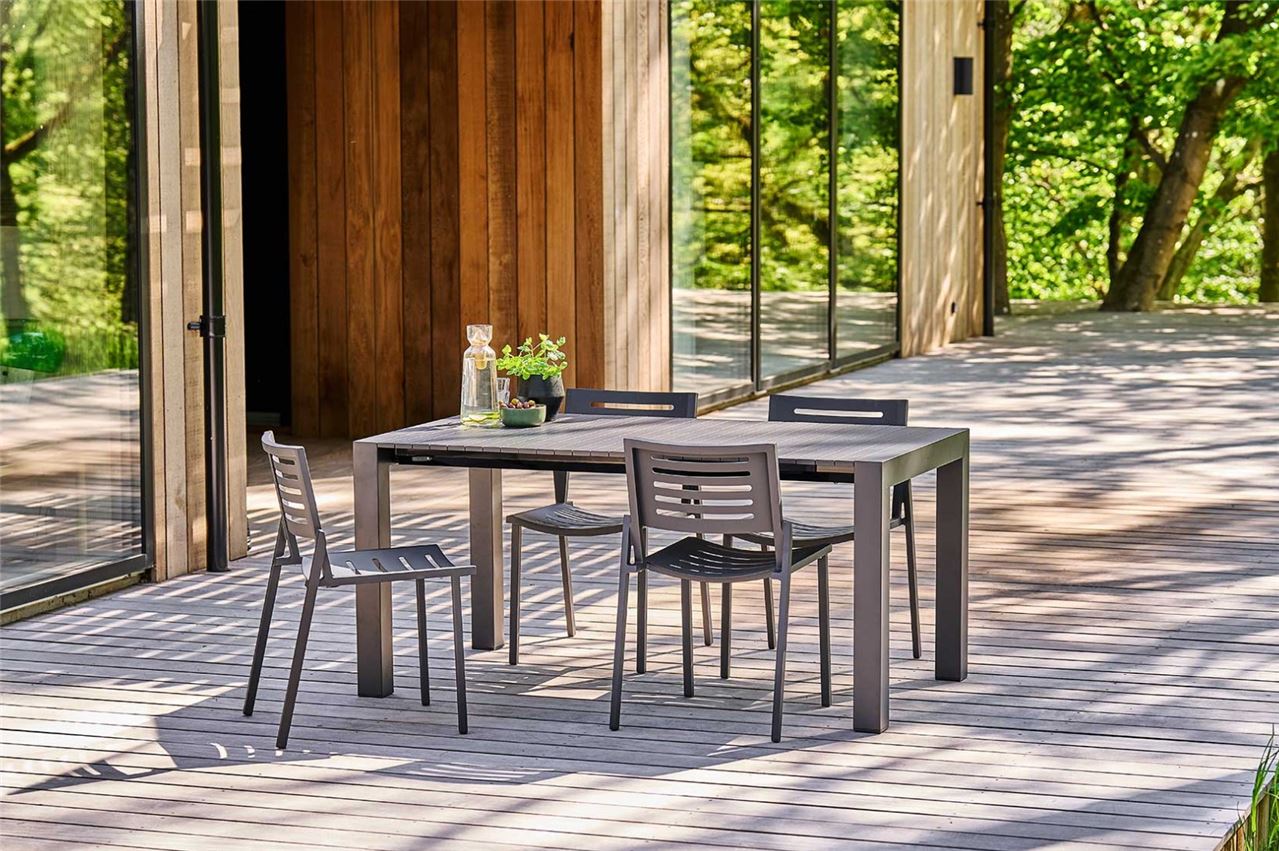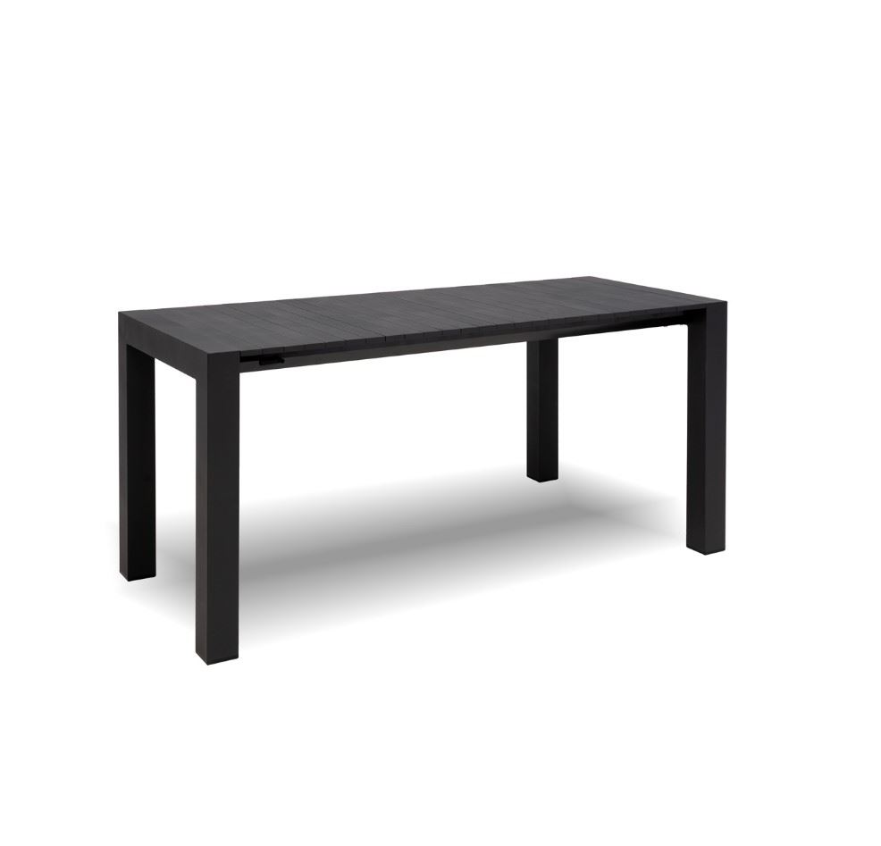Mindo 111 balcony spisebordet er et yderst unikt aluminiums spisebord med udtræk. Udtrækspladen er ikke som en traditionel udtræksplade. Hos Mindo 111 spisebordet er bordpladen designet til at udvide sig så snart der trækkes i en ende af bordet. Dette gør udvidelsen nem og hurtig, uden at der skal løsnes hængsler eller løftes ekstra bordplader. Spisebordet i sig selv er elegant og stilrent, hvilket passer ind på enhver terrasse.