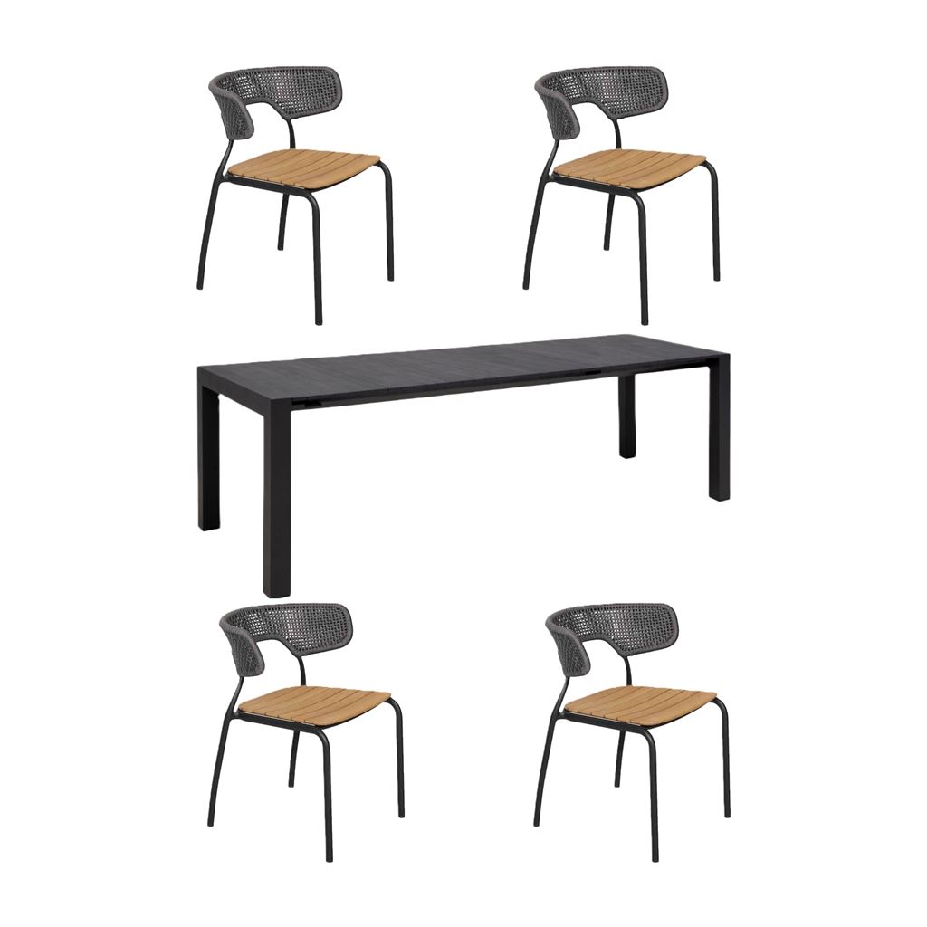 Dette havemøblelsæt består af Mindo 111 spisebordet og 4 stk. Mindo 101 spisebordsstole. Spisebordet er et yderst unikt aluminiums spisebord med udtræk. Udtræk
