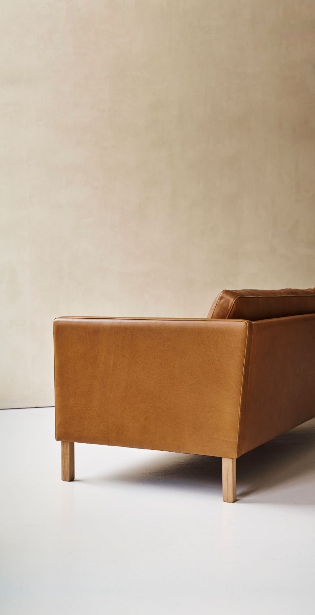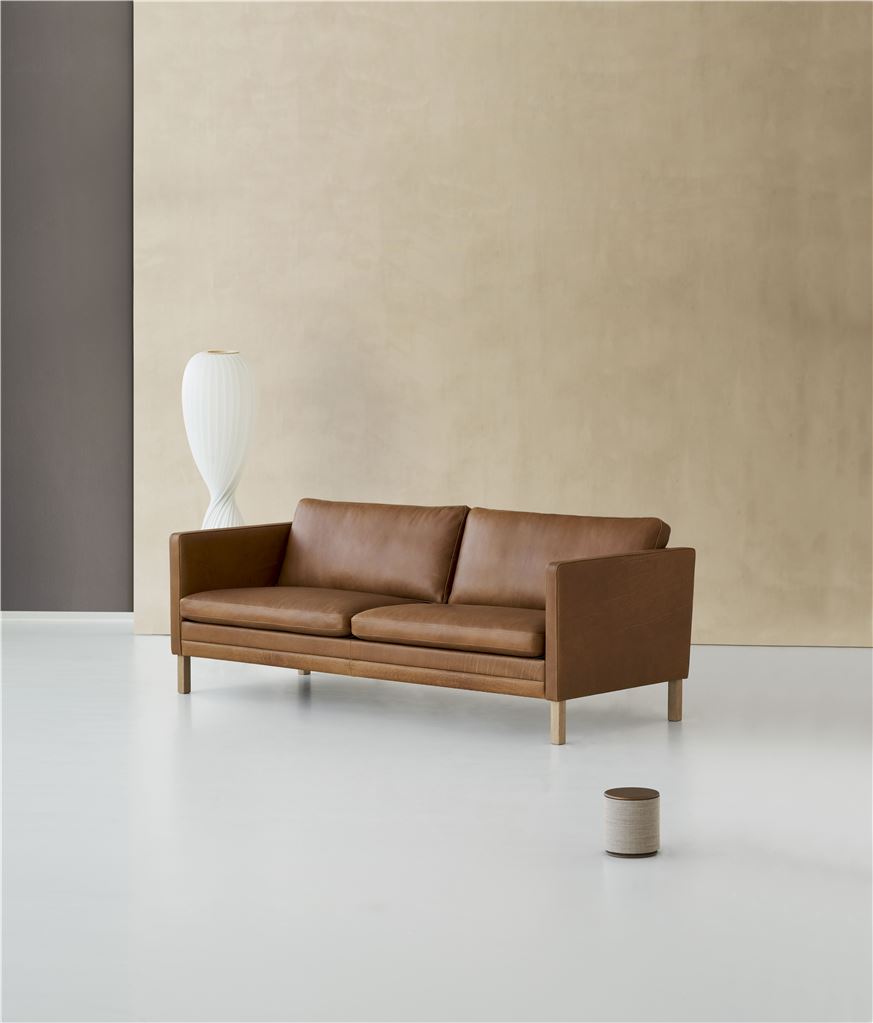 Sofaen er polstret med Frej læder fra Mogens Hansen. Læderet er Mogens Hansens eget udviklede anilinlæder. Det er et læder med smukke aftegninger og en unik siddekomfort.