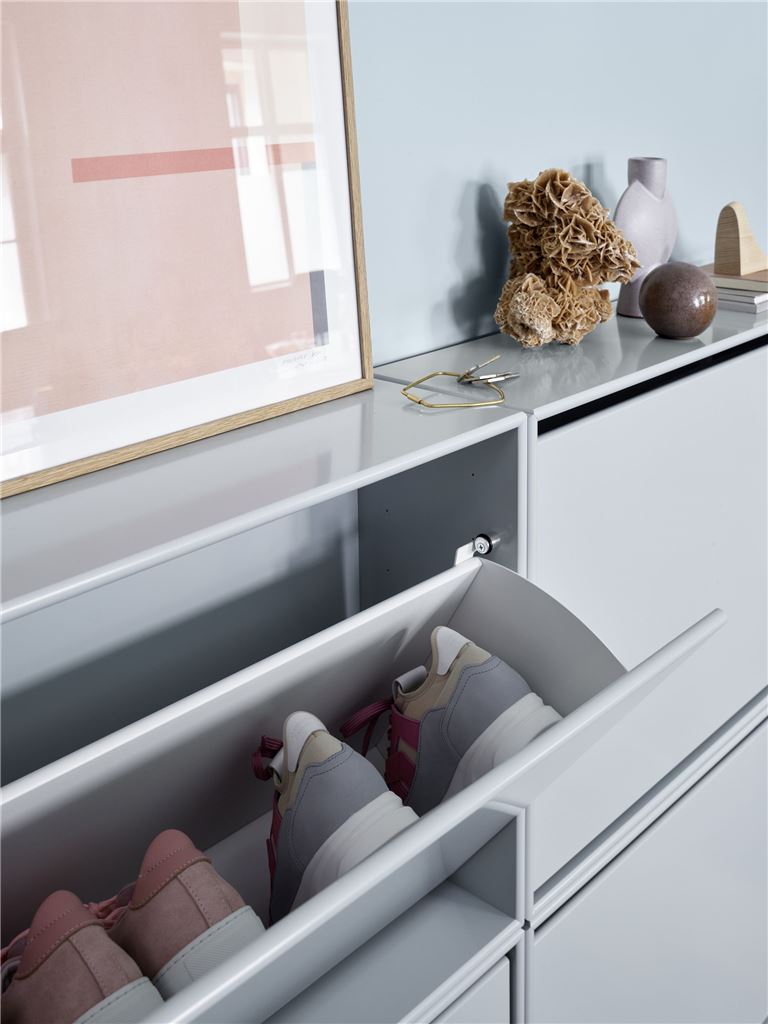 Fint og praktisk skoskab fra Montana, designet af Peter J. Lassen. Skoskabet er en del af Montanas Hall serie, som består af flere stilrene og ikke mindst funktionelle elementer, der nemt kan kombineres og tilpasses efter det enkelte behov. Det lette og slanke design gør skoskabet ideelt til den mindre entré, hvor funktionalitet er i fokus. Gem sko, vanter, huer og diverse andre accessoires væk og gør entréen nydelig til når du eller dine gæster går ind af døren til entréen. I de fleste tilfælde er entréen det rum i hjemmet der ses først, hvorfor lige nøjagtigt dette rum prioriteres højt. Entréen skal gerne have en personlig indretning, som ikke mindst følger den røde tråd i resten af hjemmet. Montana skoskabet er perfekt til at skabe et personligt udtryk, da farvemulighederne på de lakerede fronter er mange, samtidigt med at du kan tilføje tilbehør efter din smag. Skabet består af en vippeskuffe og en indvendig plastikmåtte, som beskytter selve skoskabet for snavs og ridser, hvilket medvirker til at netop dette skoskab fremstår pænt og nydeligt i mange år ud i fremtiden. Skabet er 20 cm i dybden, hvilket giver plads til 2-3 par sko.