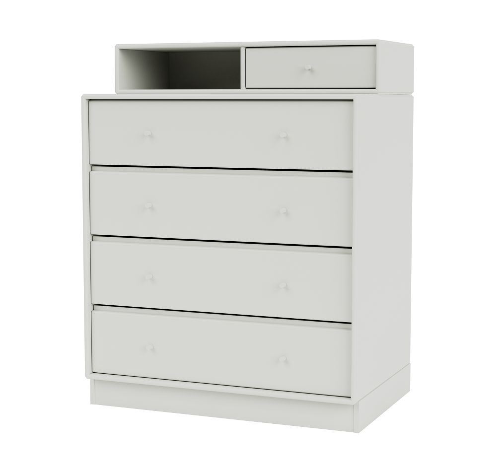 Smuk kommode med ben fra Montana. Med kommodens fire rummelige skuffer er den ideel til opbevaring af personlige gentande i soveværelset eller som en praktisk opbevaringsløsning til enten stuen eller entréen. Kommoden har et åbent rum samt et lille skuffemodul øverst, som passende kan rumme dine smykker, kalender eller andre småting. Det øverste hyldemodul kan nemt hænges for sig selv, således kommoden anvendes alene, hvis man ønsker fornyelse i sit Montana møbel. Kommodens skarpe og rene linjer gør, at det ikke alene er et funktionelt og alsidigt møbel, men også et minimalistisk og æstetisk element i enhver indretning.