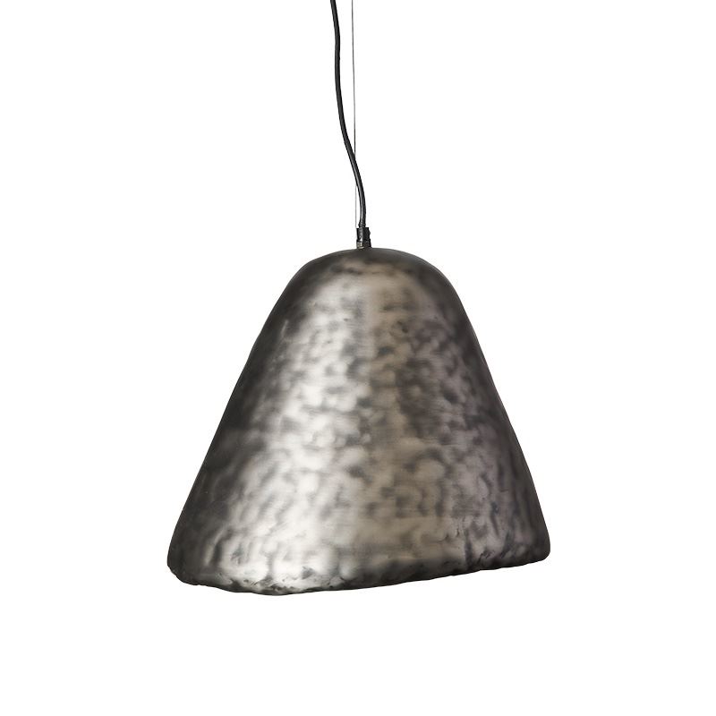 Hima er en rustik og asymmetrisk lampe i stål, designet med en banket, rå overflade, der sender tankerne tilbage på rustikke fabrikshaller. Den smukke grå farve er patineret og skaber referencer og fortællinger tilbage til industrielle tidsalder.