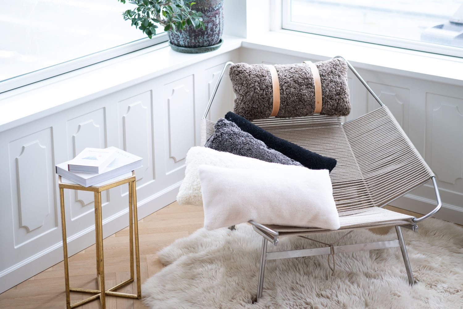 Fin rektangulær pude fra Natures Collection. Med dens praktiske størrelse, passer den perfekt til sofaen eller en bænk. Denne pude vil passe ind i enhver indretning, som vil sprede en masse hygge rundt i hjemmet. Skindet er nemt at holde og kræver ganske lidt pleje. Bagsiden af puden består af lammeskind, og der er anbragt en lynlås i pudens syning, således pudefyldet nemt kan udskiftes.