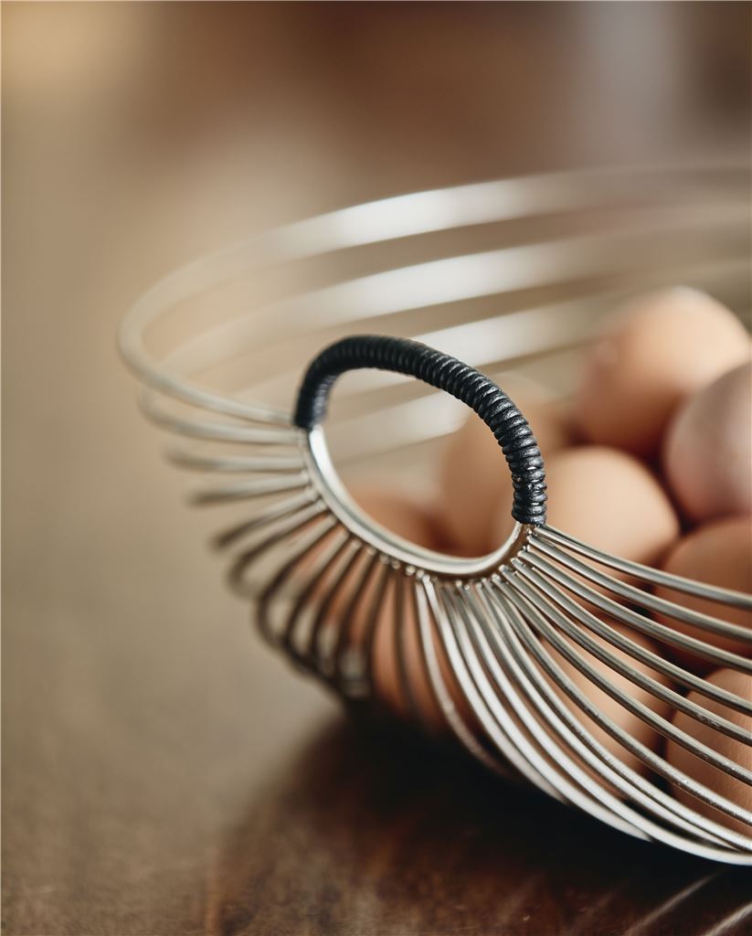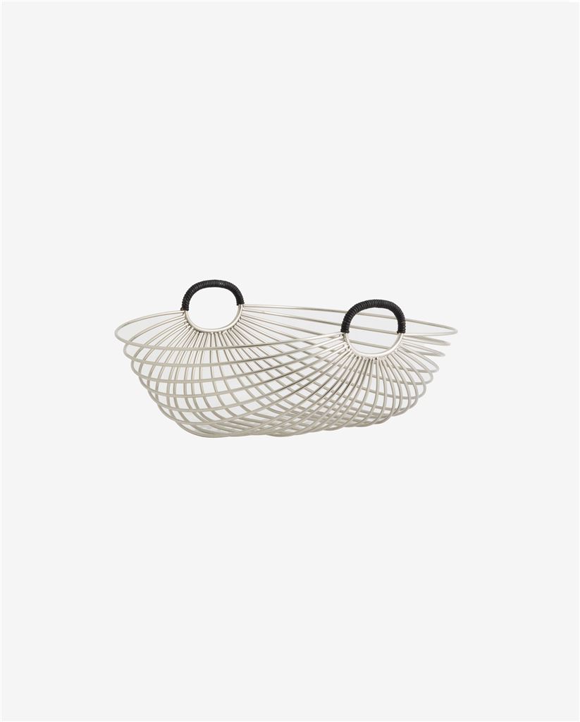 JAIPUR kurv i krom med sorte håndtag er enkel og minimalistisk med mange anvendelsesmuligheder. Det lette og luftige design gør den både dekorativ og praktisk til opbevaring af fx frugt og brød. De smalle linjer skaber et smukt spil af lys og skygge, mens håndtagene tilføjer kontrast.