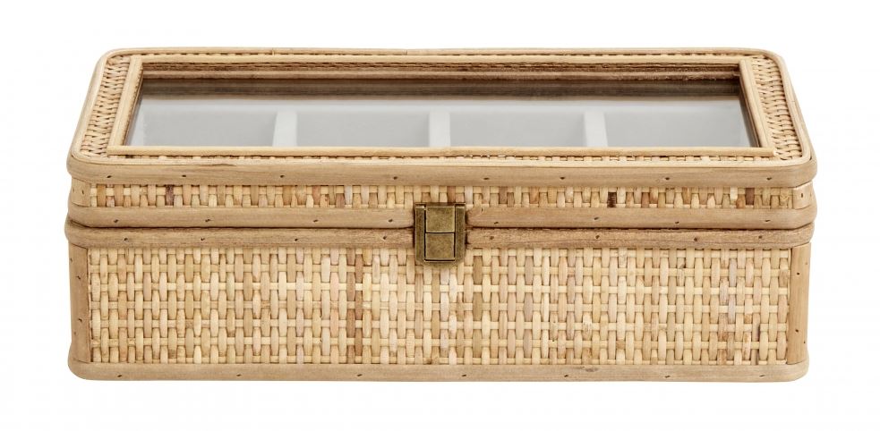 Fra Nordal kommer dette smukke smykkeskrin, som er fremstillet i naturfarvet rattan. Smykkeskrinet er indvendigt betrukket med gråt fløjl og opdelt i syv små rum. Boksens låg prydes af et gennemsigtigt "vindue", hvilket gør designet både elegant og charmerende og den yndige lukkeordning i gylden farve fuldender hele det smukke smykkeskrin. Brug eksempelvis smykkeskrinet til opbevaring af dine yndlingssmykker eller ure, eller brug den på kontoret til at holde styr på små vigtige noter, kort osv.