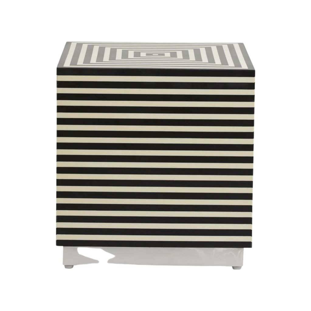 TAURA-bordet er et stilfuldt og unikt møbel til din indretning. De sorte og hvide striber skaber et klassisk look, mens mønsteret tilføjer et friskt og moderne præg. Bordet er fremstillet af en kombination af harpiks og mangotræ, hvilket giver det både karakter og holdbarhed