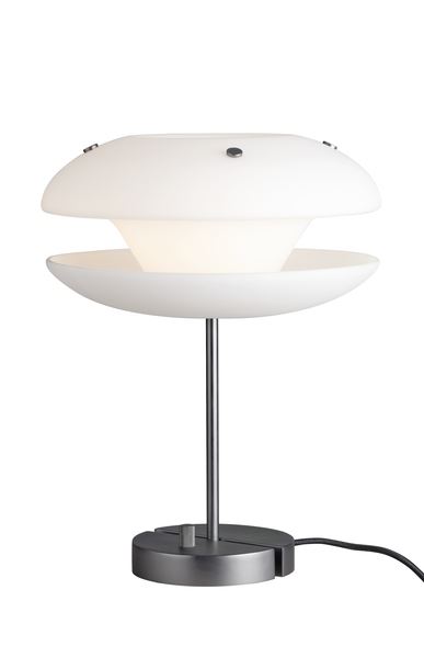 Smuk bordlampe fra NORR11. Den fine bordlampe er inspireret af formerne på en Yo-Yo. Lampen kendetegnes ved to cirkulære opale glasskygger, der er placeret overfor hinanden og skaber forskellige lag for at skjule lyskilden.