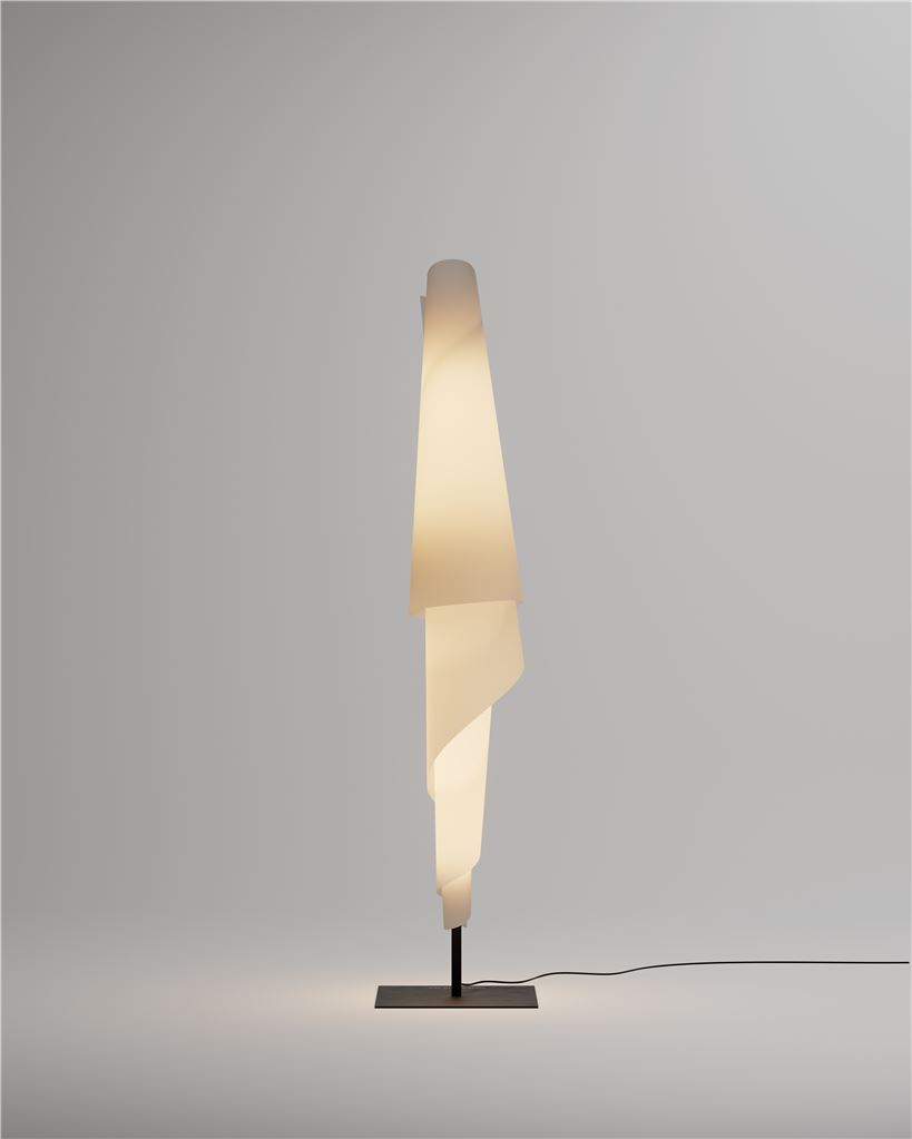 ALTA COSTURA er en lampe, der består af en diffuser, som omslutter en stålmast med en struktureret sort finish. Lampen bevarer sin form takket være speciallavede knapper, som forsigtigt skrues på bagsiden. Når kunden monterer lampen, efterligner de skrædderens omhyggelige arbejde. Lyskilden udsender et varmt og beroligende lys med tekstur.