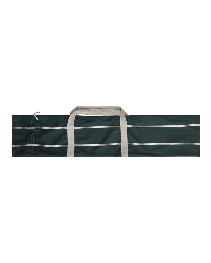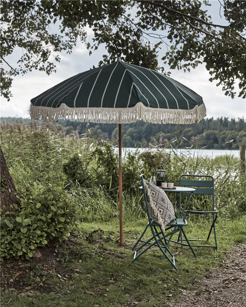 Nyd en varm sommerdag i skyggen under denne haveparasol fra House Doctor. Beige striber mod en mørkegrøn baggrund kombineres med lange, tykke frynser, hvilket skaber et smukt vintage-inspireret look. Uanset om din terrasse er møbleret med træ, beton eller metal, tilføjer denne haveparasol en elegant detalje med raffineret æstetik. Træstangen kan let adskilles, så parasollen kan opbevares praktisk i den medfølgende pose. Dette gør det også nemt at tage parasollen med på udflugter eller til stranden.