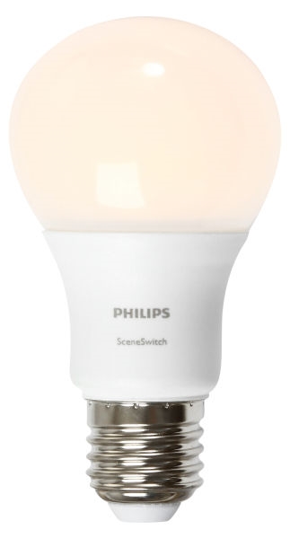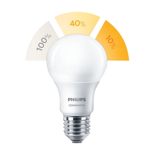 SceneSwitch LED pære fra PHILIPS. Med SceneSwitch fra Philips kan du skifte stemningen i rummet med et tryk, så du kan tilpasse det lige nøjagtigt til det du foretager dig - og alt du behøver for at ændre indstillingen, er din eksisterende kontakt. Med SceneSwitch pæren får du direkte adgang til en række belysningsscener, som kan tilpasses dit aktuelle humør og behov. Ingen lysdæmper eller ekstra installation krævet, da hele intelligensen sidder i pæren. Gå fra varmt til meget varmt til ekstra varm belysning med et tryk på kontakten. Lyset kan skiftes fra funktionel belysning, til naturligt lys og videre til et hyggeligt, varmt og dæmpet lys, og lysniveauet ændres fra 100% til 40% til 10%, og har du flere SceneSwitch pærer kan disse synkroniseres og nulstilles til fabriksindstillinger med et enkelt tryk, og pæren er både praktisk og intelligent, den indbyggede hukommelseschip sørger for at huske din seneste lysindstilling, hvis kontakten er slukket i mere end 6 sekunder - og hvis ikke du skifter mellem aktiviteter ofte, så er lyset automatisk indstillet til din foretrukne tilstand, når du tænder det igen.