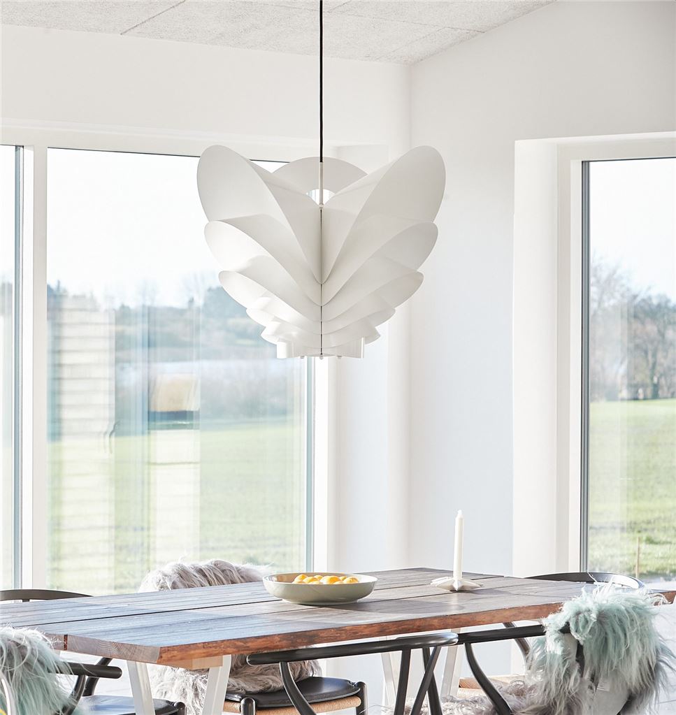 Piet Hein designede den elegante Flora Folio pendel i 1969. Den er designet til at kunne hænge i større rum. Som en stor blomst som folder skærmbladende sig ud og skaber på den måde den smukke karakteristiske form og den perfekte reflektion af lyset. Lampen har hvide skærme, som er matte på indersiden og halvblanke på ydersiden. Lampen har Piet Heins kendte superelliptiske form. Lampen vil give et smukt lys, uanset om der monteres et energibesparende kompaktlysstoftrør i lampen eller en strålende halogenpære. Pendlen har en diameter på 60 cm og en 6 meter sort tekstilledning. Pære ikke inkluderet.