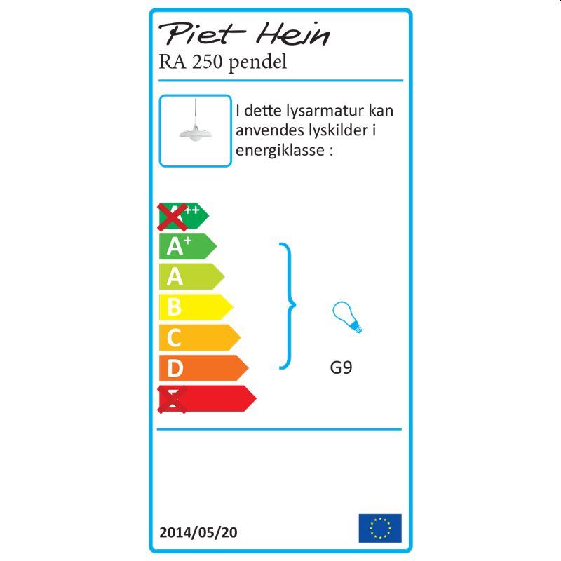 Den smukke RA pendel blev designet af Piet Hein i 1931. Pendlens konstruktion af skærmene fordeler lyset uden at blænde. Piet Hein er kendt for at benytte sig af lange matematiske formler i hans designs, og RA pendlen er bestemt ingen undtagelse. RA 250 har to sorte metalskærme og en sort tekstilledning med en længde på 3 meter. Pendlen måler 18,1 cm i højden og er en stilfuld klassiker der bestemt vil pynte over spisebordet, i entreéen eller over hjørnebordet i stuen.