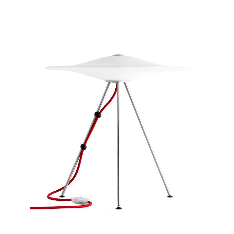 Piet Hein designede den unikke Sinus lampe i 1979. Piet Hein havde stor interesse i geometri og matematik og dette afspejles også i Sinus 440 bordlampen. Formet i den udfordrende slumpningsmetode, hvor glasset blødgøres og formes i ovnen, sikrer Sinus det perfekte lys samtidigt med at skærmen fremstår som en svævende skulptur i rummet. Bordlampens skærm har en diameter på 44 cm, og en 3 meter sort tekstilledning med afbryder/dæmper, holdt på plads med røde ringe, så du kan indstille lysstyrken lige efter behov. Pære ikke inkluderet.