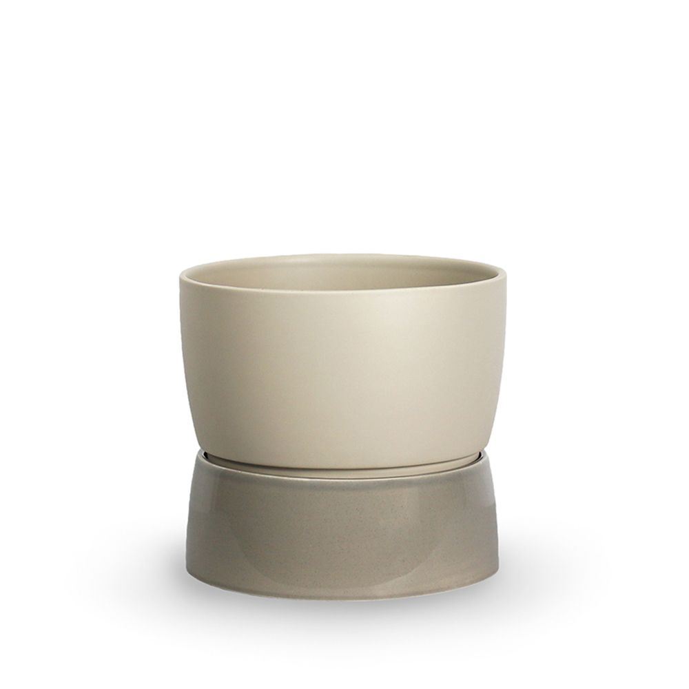 Two Tone Planter Floor en karakteristisk urtepotte, som leger med illusioner, kombinationer og kontraster. Med underskålen glaseret i en semitransparent, smålettet glasur og potten i en silkemat glasur, adskiller og komplementerer de to enheder hinanden.
