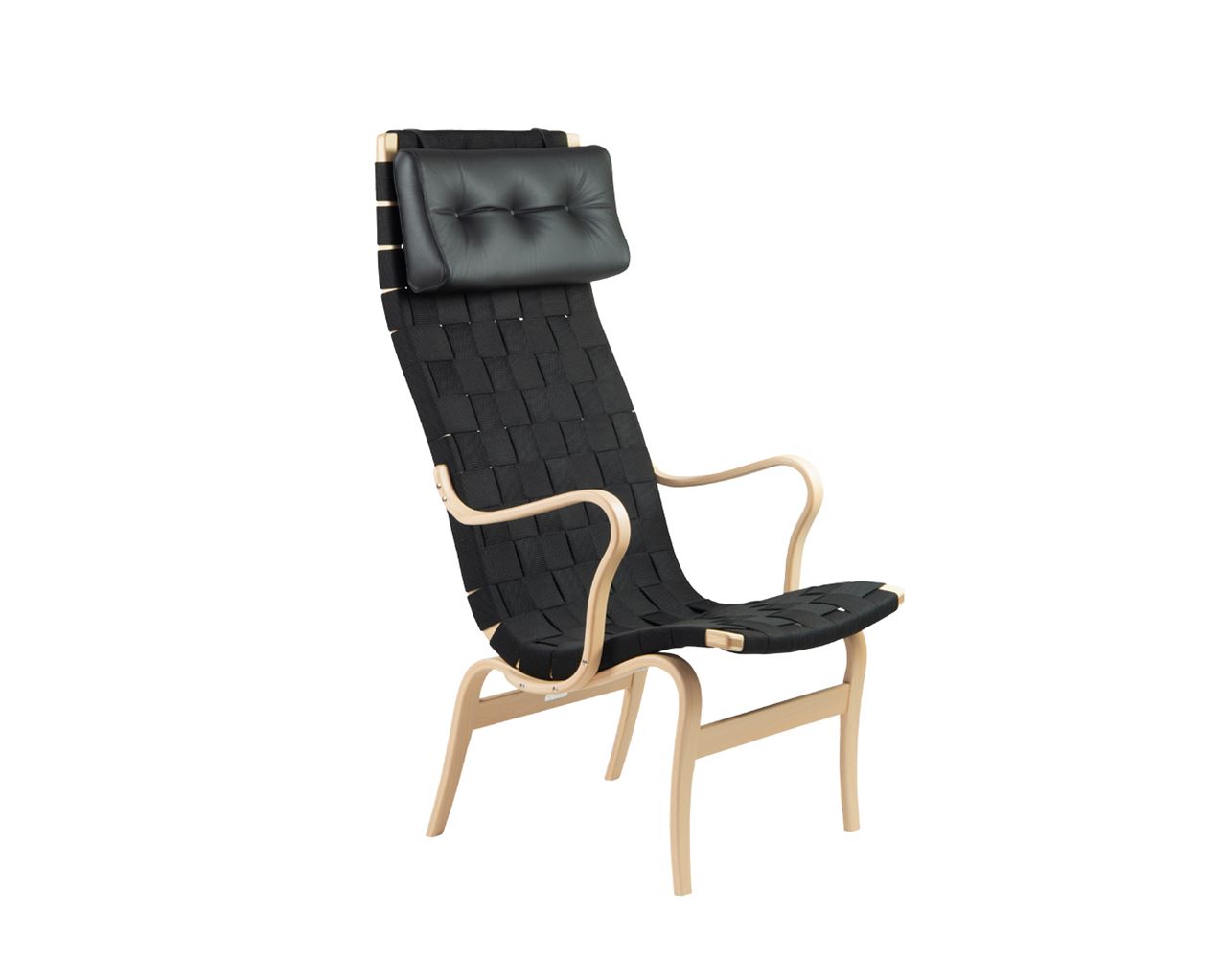 Bruno Mathsson Mi 473 Eva Lænestol Høj Ryg m. Arm og Nakkepude - Lakeret Bøg / Sort Linnegjord