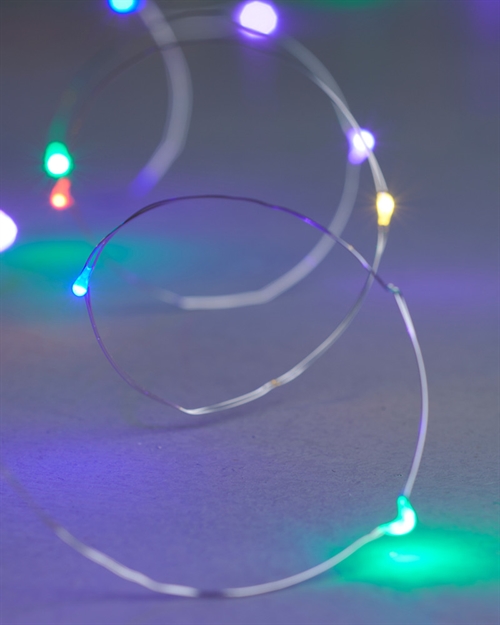 Meget dekorativ lyskæde fra Sirius, lavet af en fin sølvledning med 40 meget små fine LED lys.Kæden er 3,9 meter lang og har et multifarvet lys. Brug den f.eks i en flot klar glasvase eller lanterne, eller pynt op på børneværelset og lad dit barn nyde de smukke farver i den mørke tid. Lyskæden er batteridrevet og har indbygget timerfunktion, der slukker automatisk efter 6 timer, hvis du ikke selv slukker den. Efter 18 timer tænder lyset igen, og sådan vil det fortsætte, hvis du ikke bruger sluk knappen.