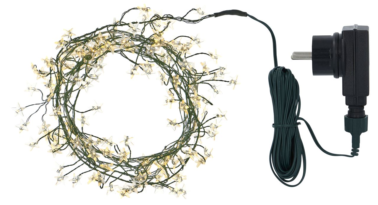 Trille lyskæden fra Sirius er lavet med flere fine grønne ledninger som går ud fra samme ledning i midten. Kæden er velegnet til at skabe en hyggelig stemning ude i haven - f.eks. på buske og træer eller i en flot lanterne. Kæden er 2+5 m lang og giver et varmt naturligt lys.