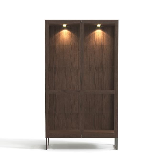 Man åbner vitrineskabet ved de to smukke glasdøre, hvori der er 4 glashylder samt 2 led lamper der giver et smukt lys inde i skabet. Derudover er der glas i siderne af vitrineskabet, så skabet virker let i en stue eller køkken. Vitrinen er ligeså dekorativ, som den er praktisk, og de markante trærammer skaber en smuk kontrast til delikate glas og nips. Skabet står på to sorte stål ben.