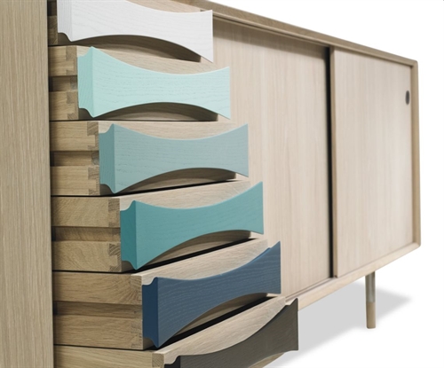 Snedkergaarden Arne Vodder AV01 skænk L: 220 cm - Multiblå skuffer/Eg