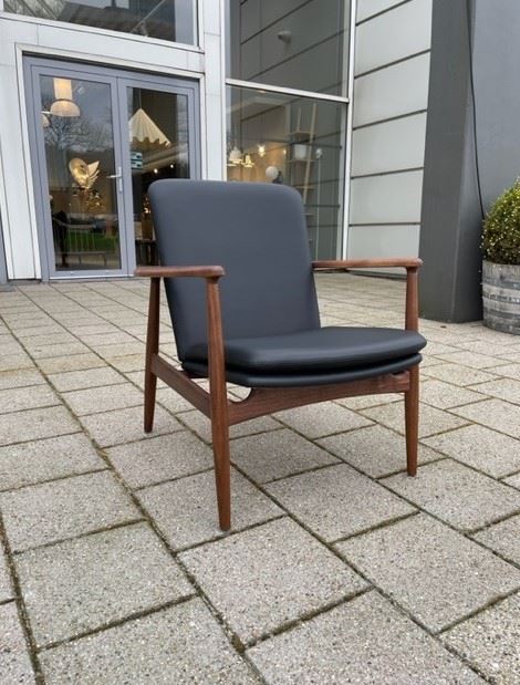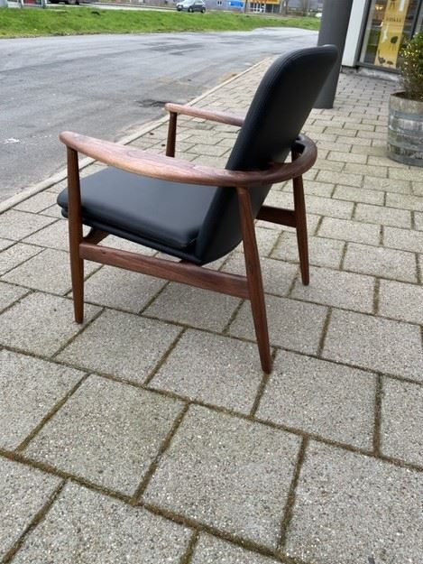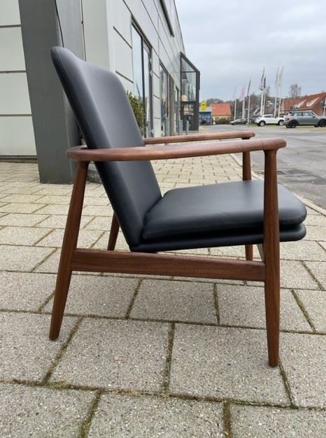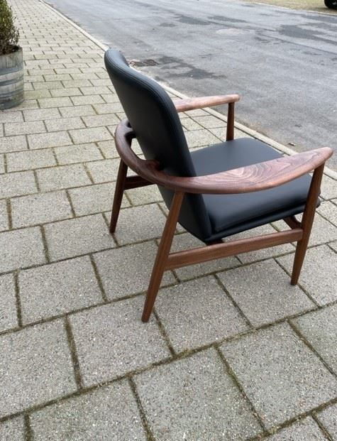 Denne smukke stol fra Snedkergaarden er designet af Arne Vodder. Den mørke olierede valnød skaber i kombination med det sorte læder, et varmt og indbydende miljø hvor du kan sidde og nyde tilværelsen med en varm kop kaffe eller en god bog.