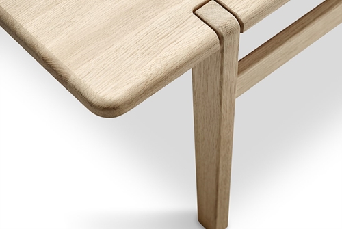 Bordet er enkelt udført i massivt træ og har lækre detaljer som afrundede hjørner og affasede kanter. Den mest iøjnefaldende detalje er benene, der går op igennem bordpladen.