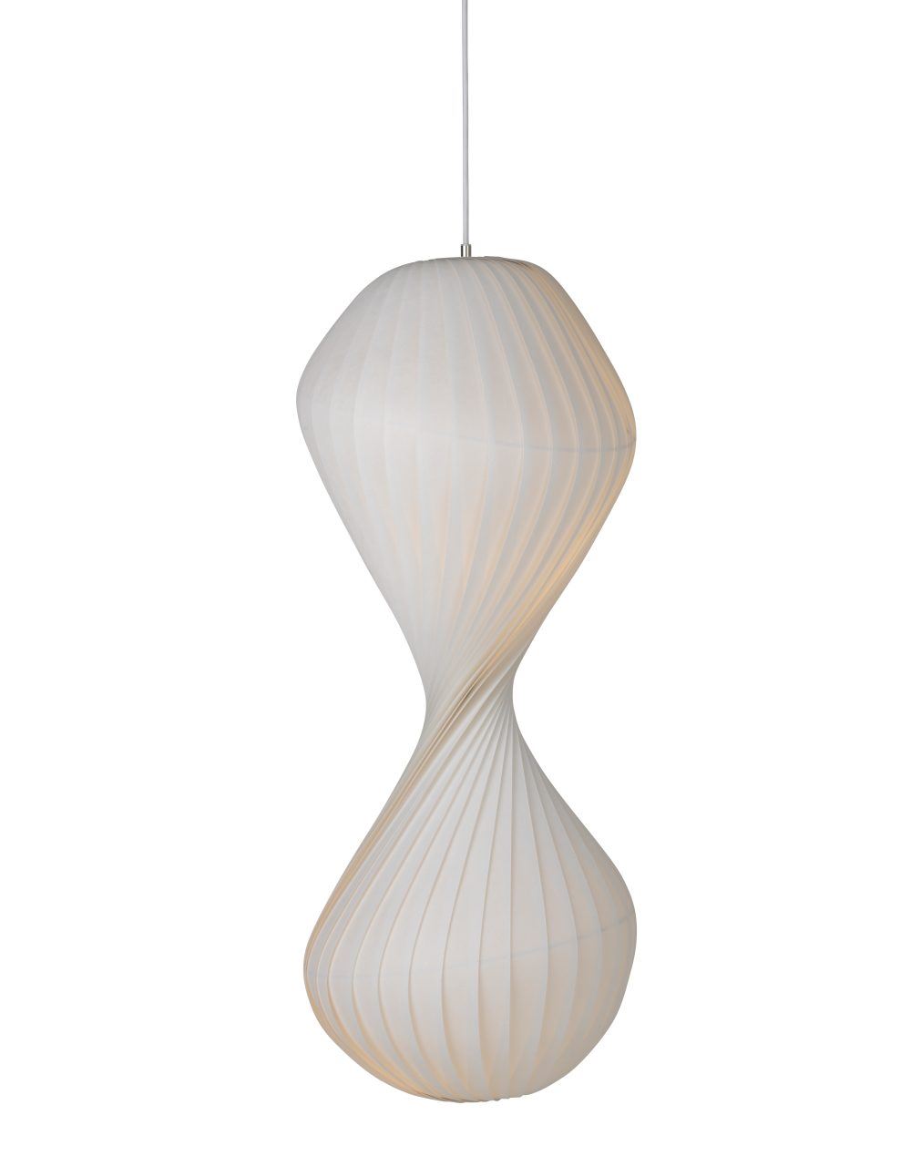 Skøn pendel fra Tom Rossau. TR-32 er en skulpturel og elegant lampeserie med organiske og bløde former. Pendlen har et stort lysvolumen, som giver god og på samme tid behagelig belysning. Lampeskærmens unikke udformning, samt teksturede overflade sørger for et blødt og behageligt lys som passer til de fleste omgivelser i et hjem. Pendlen er fremstillet af striber der twistes omkring et bøjlestel, hvoraf denne skønne med den asymmetriske figur opstår. Det asymmetriske udtryk gør, at lampen ændrer form afhængigt af hvilket perspektiv du ser lampen fra. Lampen har nærmest et kropsligt udseende og volumen som med sin skulpturelle form tilfører karakter til et rum.