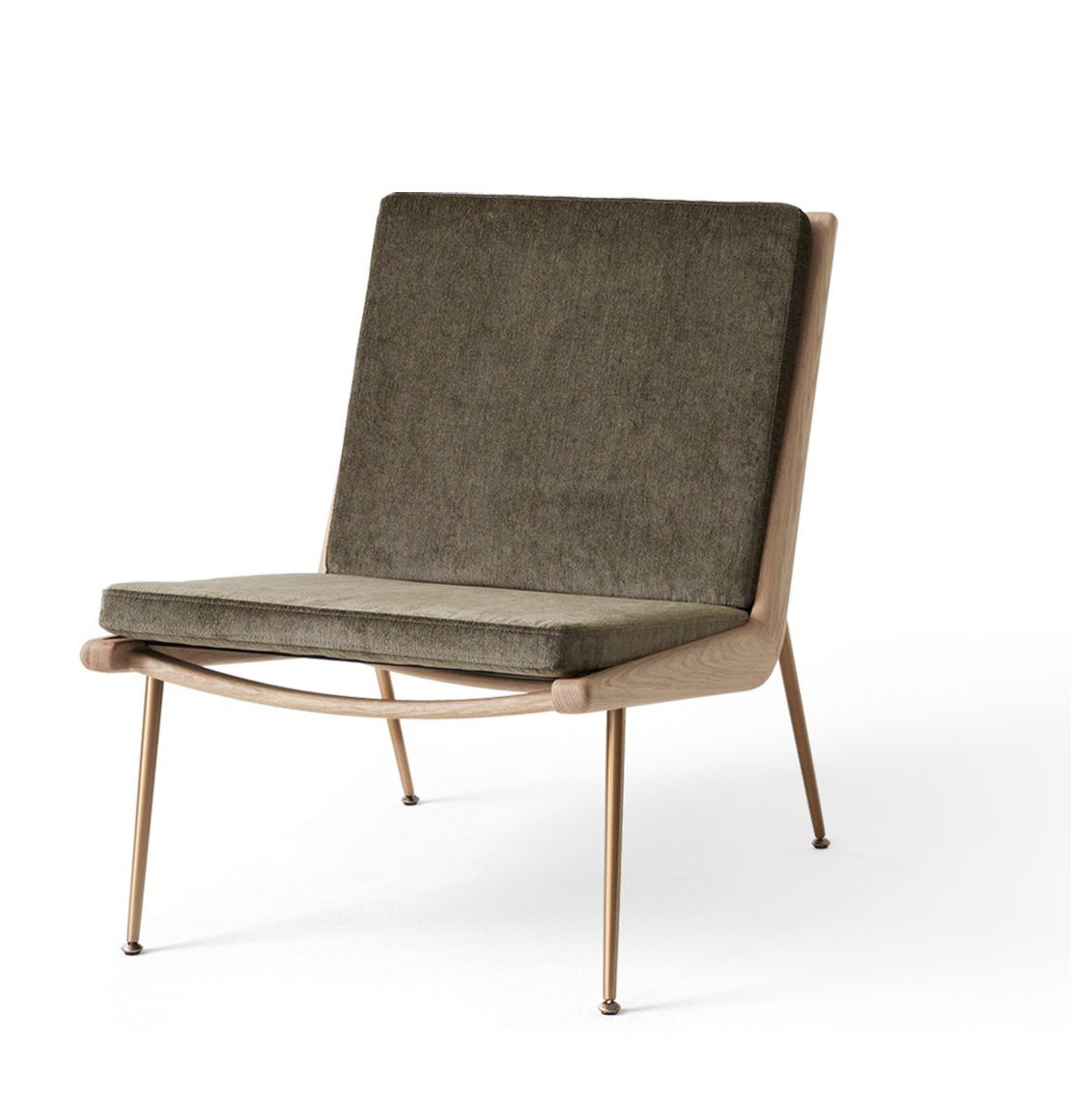 Skøn loungestol fra &Tradition. Loungestolen debuterede i 1956 og er designet af Hvidt & Mølgaard, som designede denne stol som et mesterværk indenfor dansk design. Den skønne loungestol har et let og elegant udtryk, som vil passe godt ind i de fleste moderne hjem. Boomerang HM1 stolens ben af messing og stel af hvidolieret egetræ, samt fine polstring er i perfekt harmoni med hinanden og skaber et indbydende udtryk. Brug stolen som en funktionel og fin siddeplads ved bogreolen eller pejsen i stuen eller der hvor den vil passe ind i din indretning.