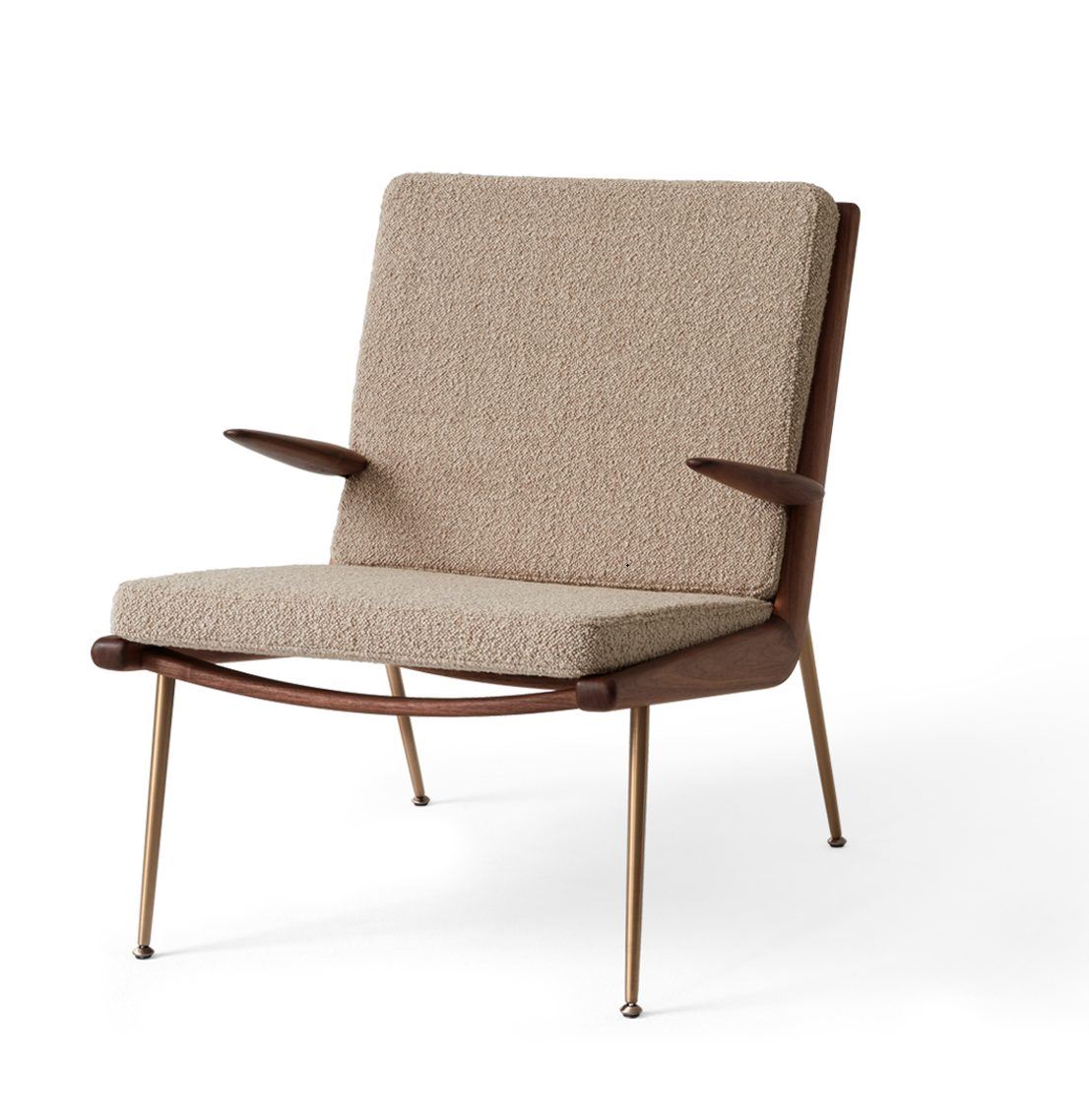Skøn loungestol fra &Tradition. Loungestolen debuterede i 1956 og er designet af Hvidt & Mølgaard, som designede denne stol som et mesterværk indenfor dansk design. Den skønne loungestol har et let og elegant udtryk, som vil passe godt ind i de fleste moderne hjem. Boomerang HM2 stolens ben af messing og stel olieret valnød, samt fine polstring er i perfekt harmoni med hinanden og skaber et indbydende udtryk. Brug stolen som en funktionel og fin siddeplads ved bogreolen eller pejsen i stuen eller der hvor den vil passe ind i din indretning.