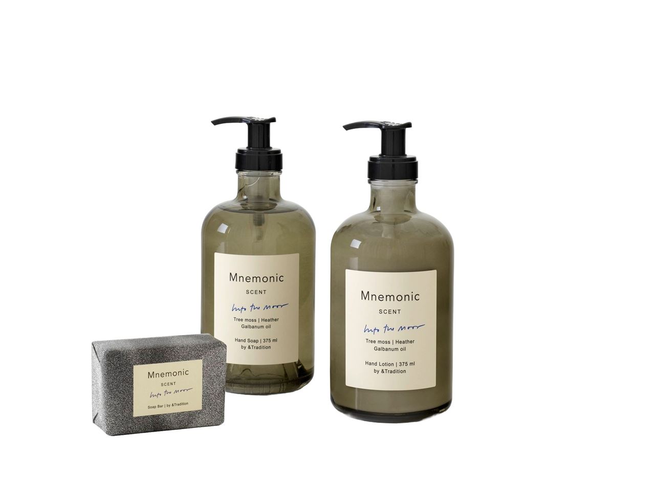 Alle produkter i Mnemonic-serien er udviklet med brancheeksperter for at levere naturlige og nærende ingredienser til dig. Den flydende sæbe og håndfugtighedscreme ankommer i en håndlavet glasflaske fremstillet i Italien, mens hver sæbestykke er indesluttet i en forvrænget, sort/hvid papirindpakning, designet til at fremmane tanker om en tåget hukommelse.