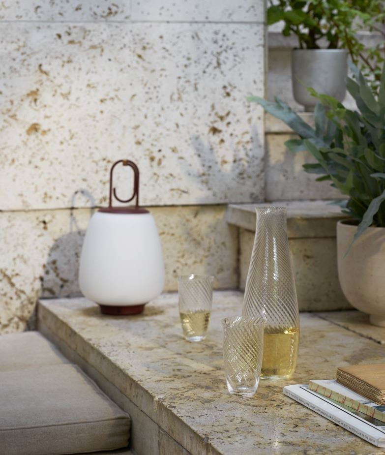 Karaffel fra &Tradition. Karaflen er håndlavet i mundblæst glas og har et flot moderne udseende med et elegant motiv, som afspejler vandets hvirvlende natur. Karaflen er asiatisk inspireret og har en lille kant, hvor læben hviler ved brug. Den er en del af &Traditions Collect serie, og er kendetegnet ved smukt udformede, bløde møbler og boligtilbehør designet af den danske design-duo Space Copenhagen. Karaflen tåler ikke varme væsker, men tåler maskinvask op til 50 grader celsius. Låg til karaflen medfølger.