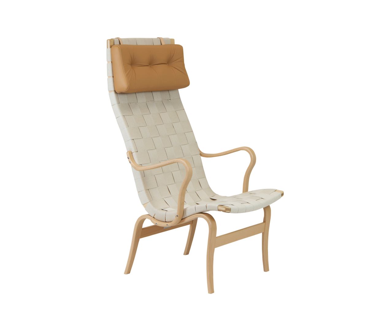 Bruno Mathsson Mi 473 Eva Lænestol Høj Ryg m. Arm og Nakkepude - Lakeret Bøg / Natur Linnegjord
