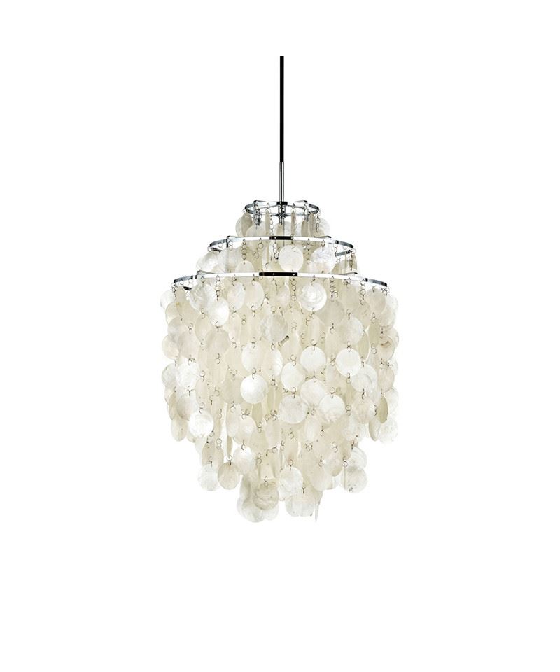 Fun pendlen er designet af Verner Panton i 1964 og er en rigtig fin og elegant pendel. Lampen har et skulpturelt udseende, og er lavet af perlemorsskaller holdt sammen af små metalringe. Lampens lys er blødt og er rigtig flot på grund af perlemorsskallerne som nærmest leger med lyset når det skinner igennem, hvilket får lampen til at se endnu mere elegant ud når den står tændt.