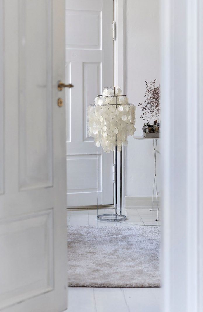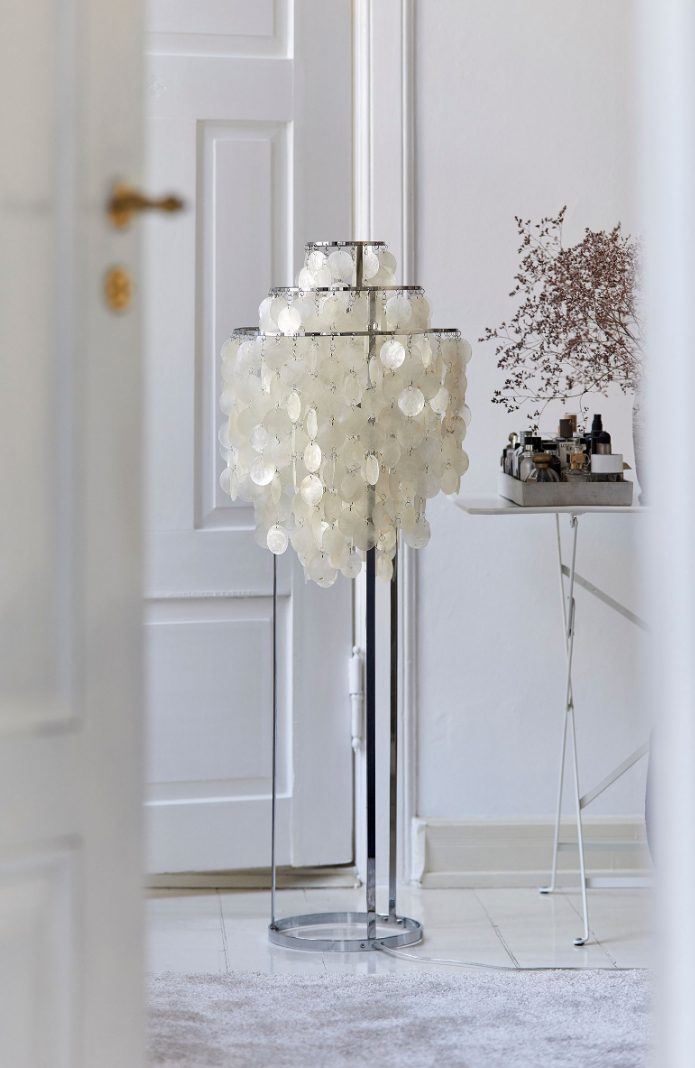 Fun gulvlampen er designet af Verner Panton i 1964 og er en rigtig fin og elegant gulvlampe. Lampen har et skulpturelt udseende, og er lavet af perlemorsskaller holdt sammen af små metalringe. Lampens lys er blødt og er rigtig flot på grund af perlemorsskallerne som nærmest leger med lyset når det skinner igennem, hvilket får lampen til at se endnu mere elegant ud når den står tændt. Lampen har en transparent ledning på 220 cm. Pære er ikke inkluderet.
