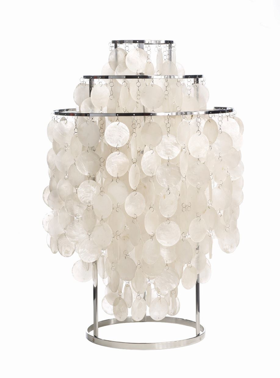 Fun bordlampen er designet af Verner Panton i 1964 og er en rigtig fin og elegant bordlampe. Lampen har et lidt skulpturelt udseende, og er lavet af perlemorsskaller holdt sammen af små metalringe. Lampens lys er blødt og er rigtig flot på grund af perlemorsskallerne som nærmest leger med lyset når det skinner igennem, hvilket får lampen til at se endnu mere elegant ud når den står tændt. Lampen har en transparent ledning med afbryder og benytter sig af en E27 fatning. Pære er ikke inkluderet.