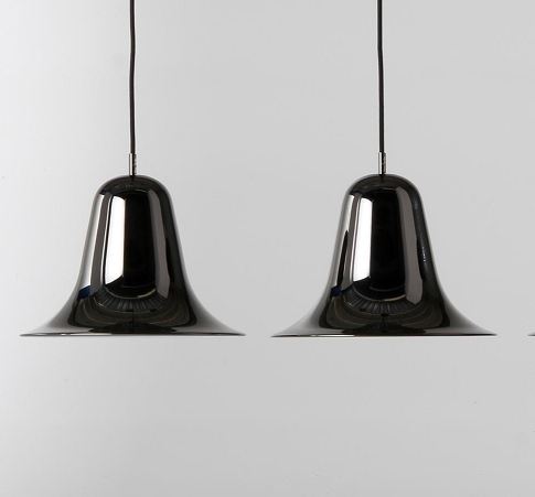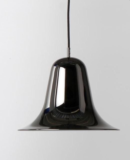 Enkel fin klokkeformet pendel lampe fra Verpan. Pantop pendlen i sort krom lakeret metal og har en smuk klokkeformet facon med fatning, som passer til en E27 pærer. Verpan lampen gør sig godt hængt i en gruppe over et sidebord i en hjørne og giver også et dejligt lys over spisebordet. Designet er let og tidløst - en klassiker fra Verpan.