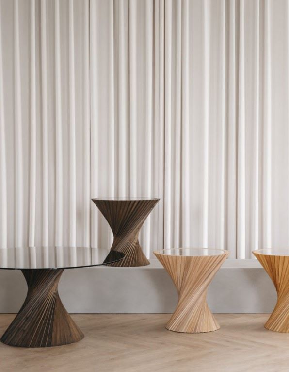 Hyperbel sidebordet fra VIA Copenhagen er tegnet af Christian Winther Johannsen som en gave til sin hustru i 2015. Dette skulpturelle sidebord kombinerer matematikkens love og naturlige materialer. Bordet består af 48 træstykker der er blevet samlet med stor præcision.