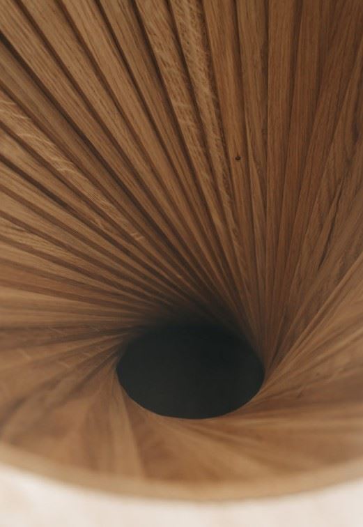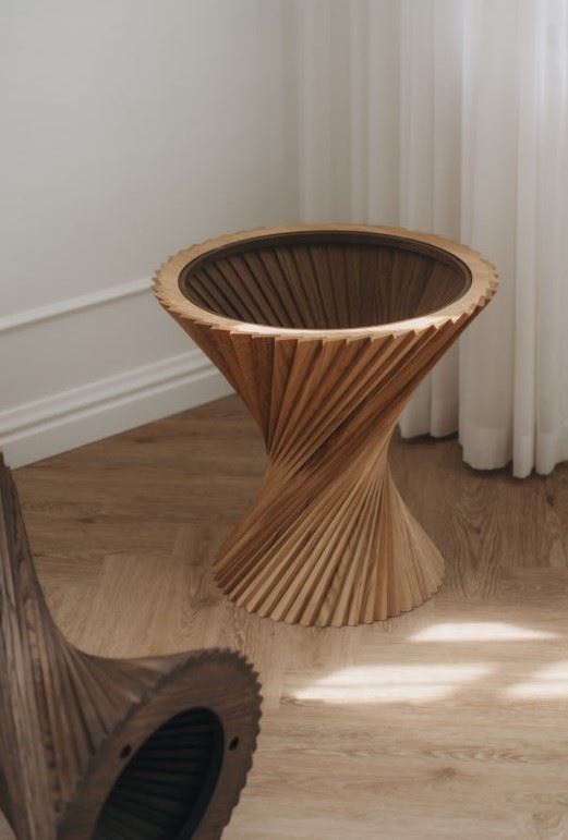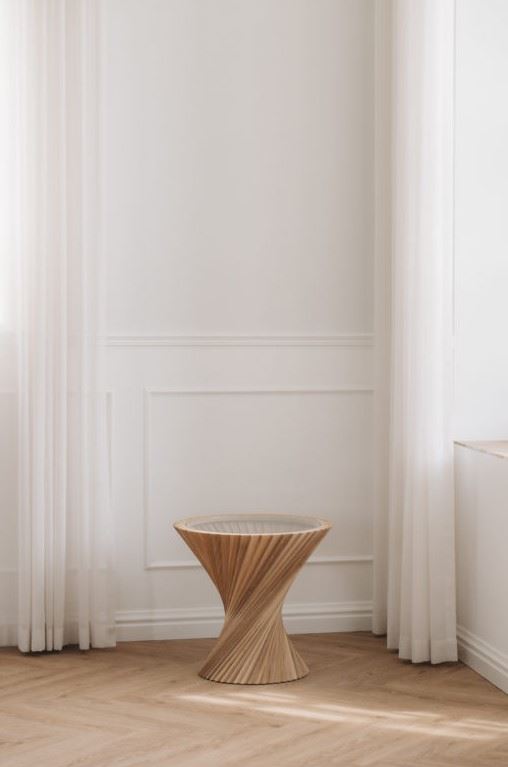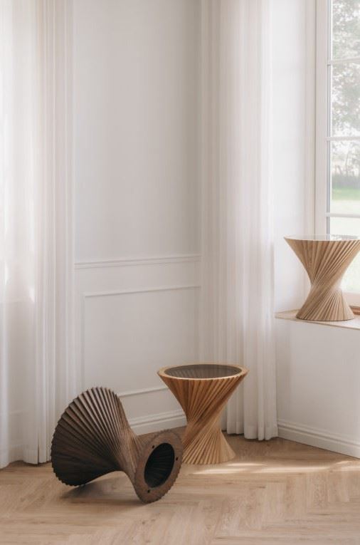 Hyperbel sidebordet fra VIA Copenhagen er tegnet af Christian Winther Johannsen som en gave til sin hustru i 2015. Dette skulpturelle sidebord kombinerer matematikkens love og naturlige materialer. Bordet består af 48 træstykker der er blevet samlet med stor præcision.